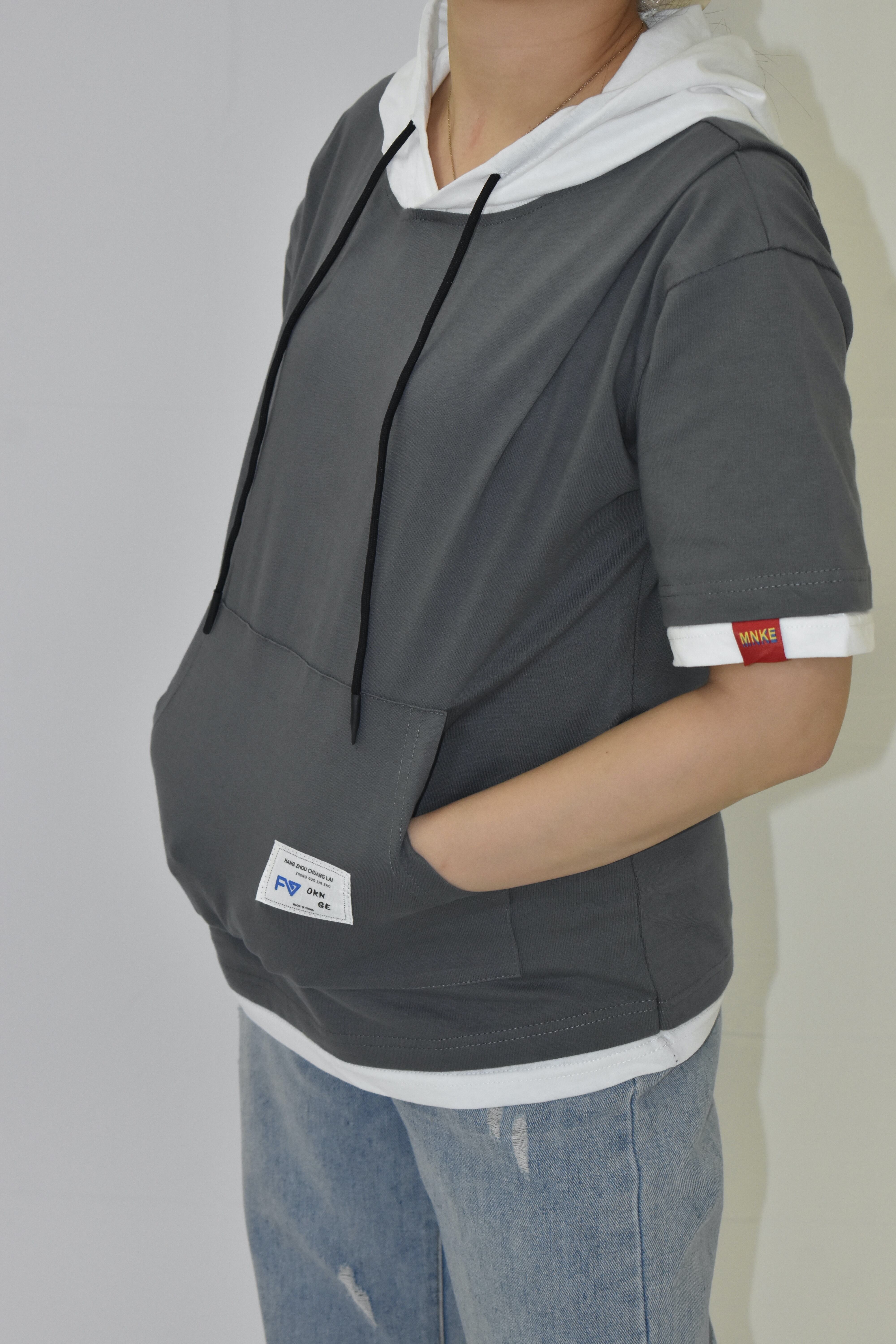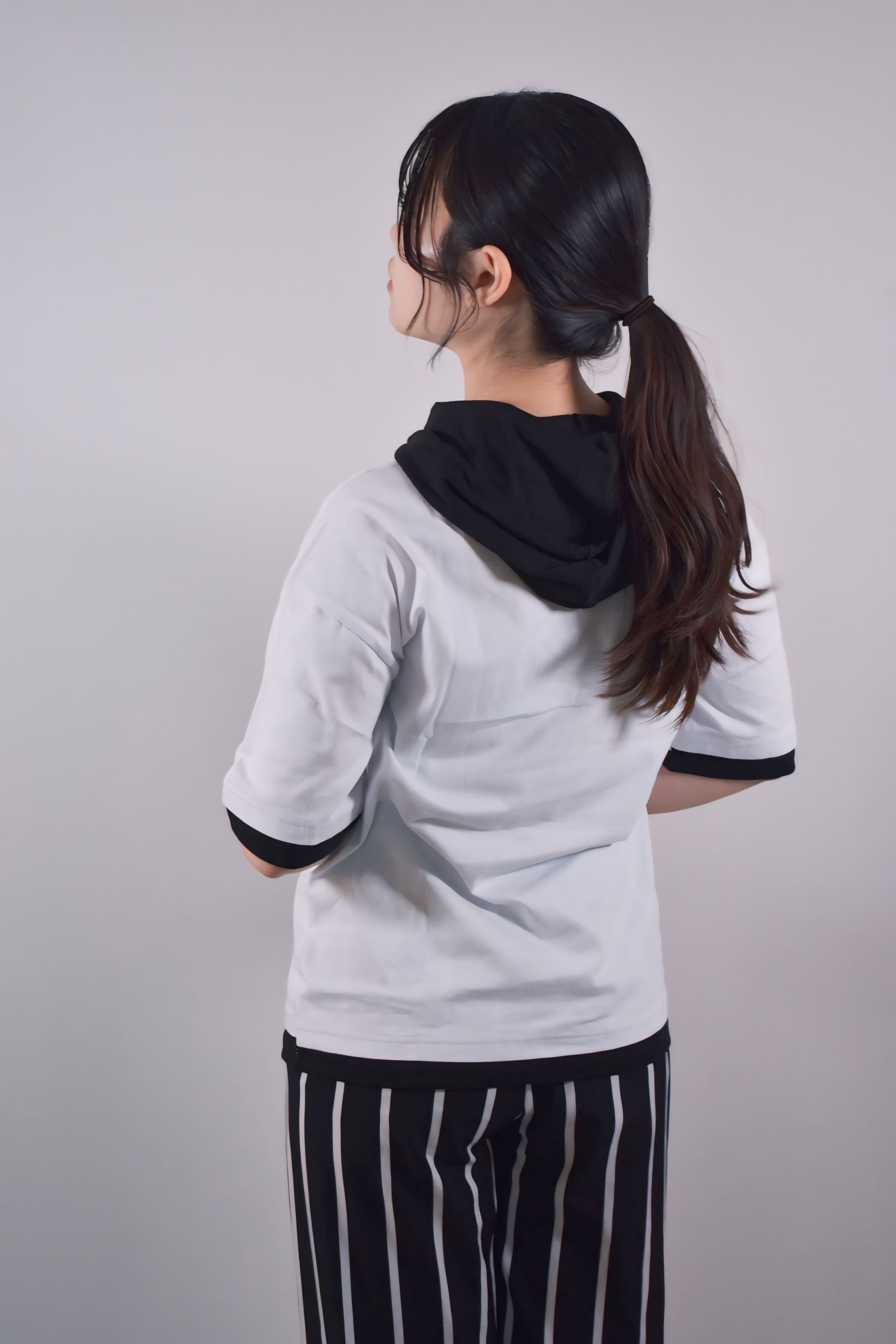 ラウンドネックパーカーは、シンプルなデザインが特徴の一枚。